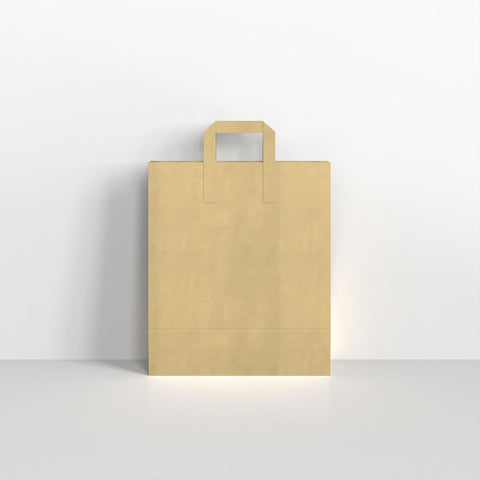 Our manila paper flat carrier bags are a sustainable and stylish way to bag your customers goods. Crafted from 100gsm brown kraft paper, these environmentally friendly paper carrier bags come in various sizes and an ergonomic flat handle design. If you need something extra special, why not contact our team about bespoke printing to match your brand or business.